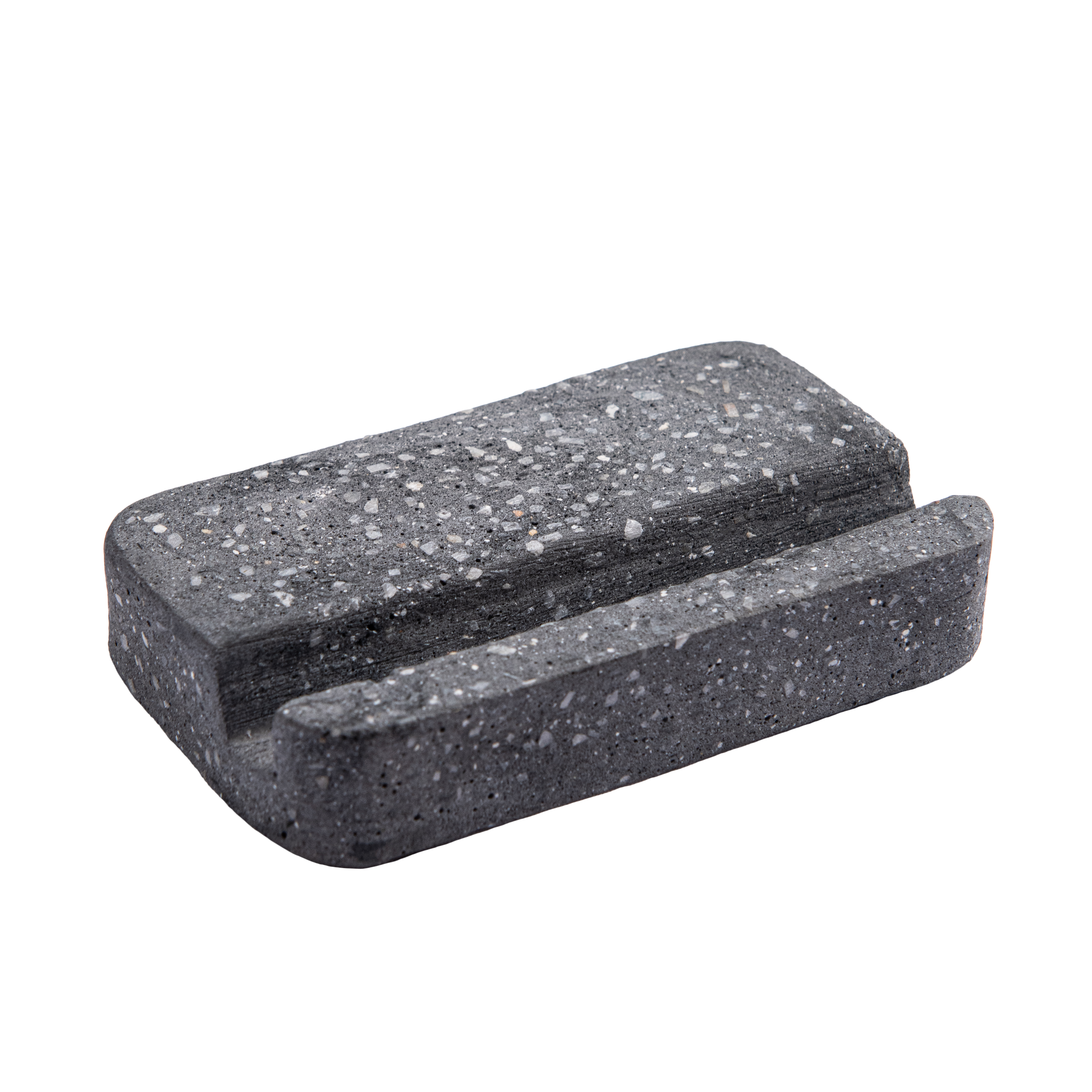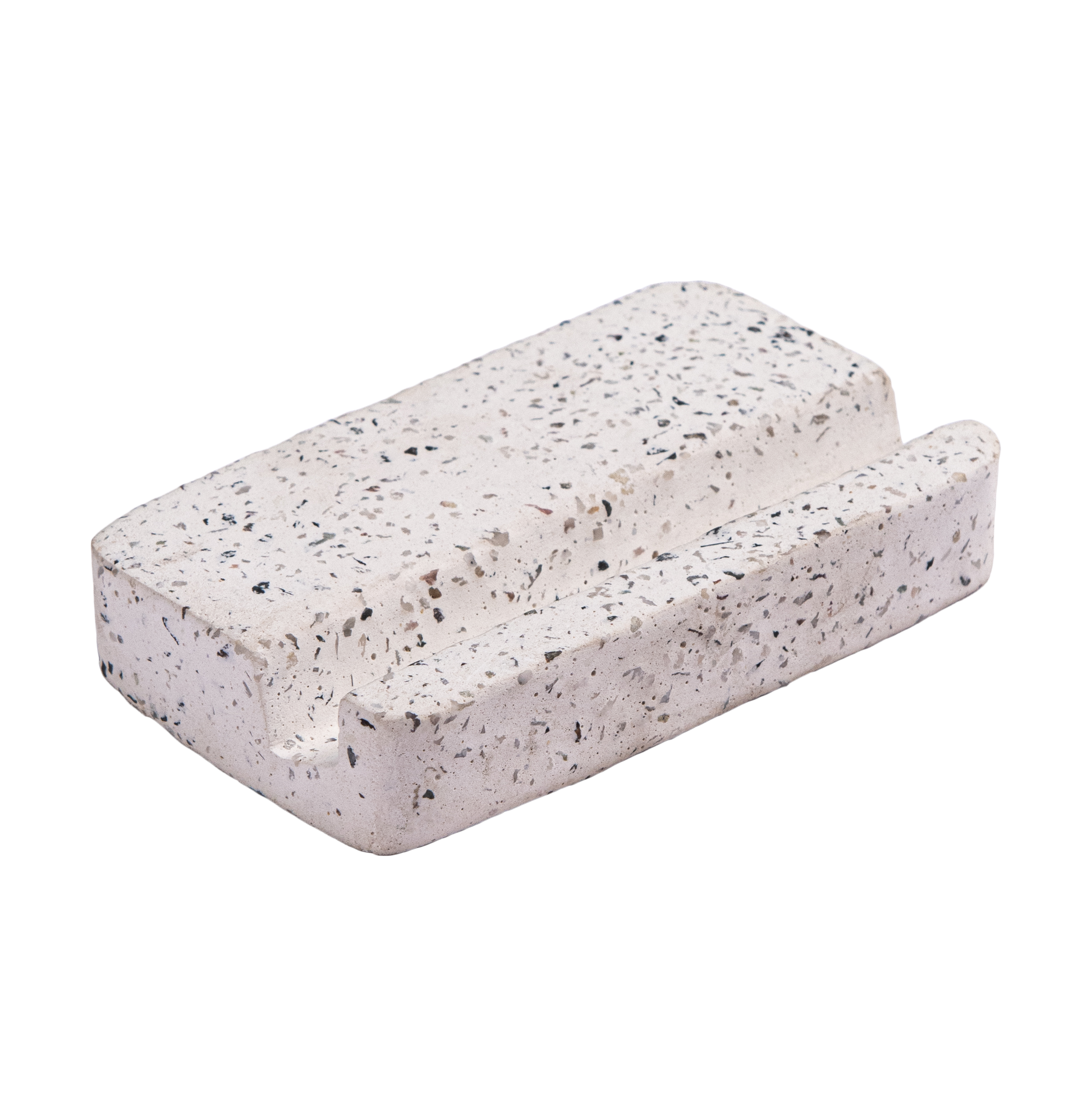 Crafted from durable terrazzo-textured cast stone, this piece features a precise angled groove that securely holds business cards, phones, or small notepads. Its clean rectangular form and modern speckled finish make it a functional yet decorative addition to any desk, reception counter, or workspace.