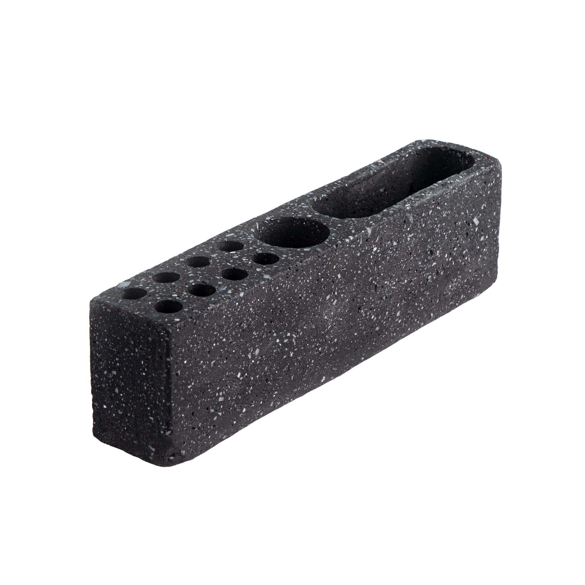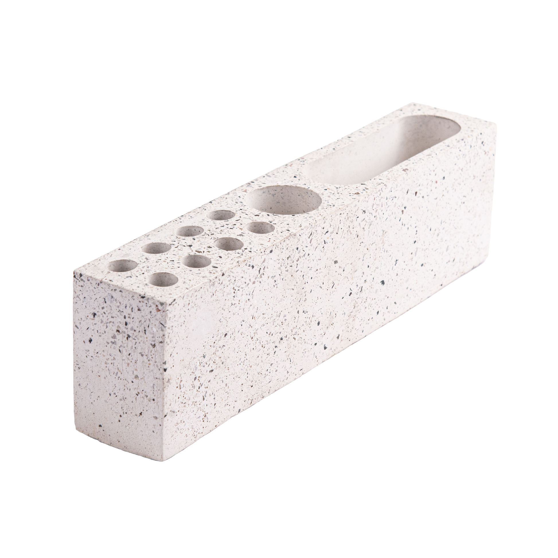 This minimalist piece features dedicated slots for pens, pencils, and small tools, plus a spacious compartment for your phone or other essentials. Handcrafted in durable terrazzo-style cast stone, it adds both function and elegance to any modern office or home desk.